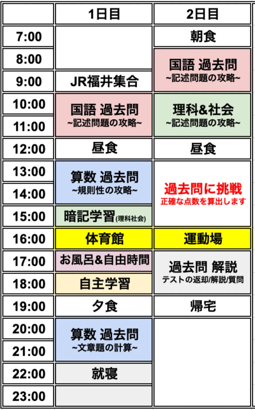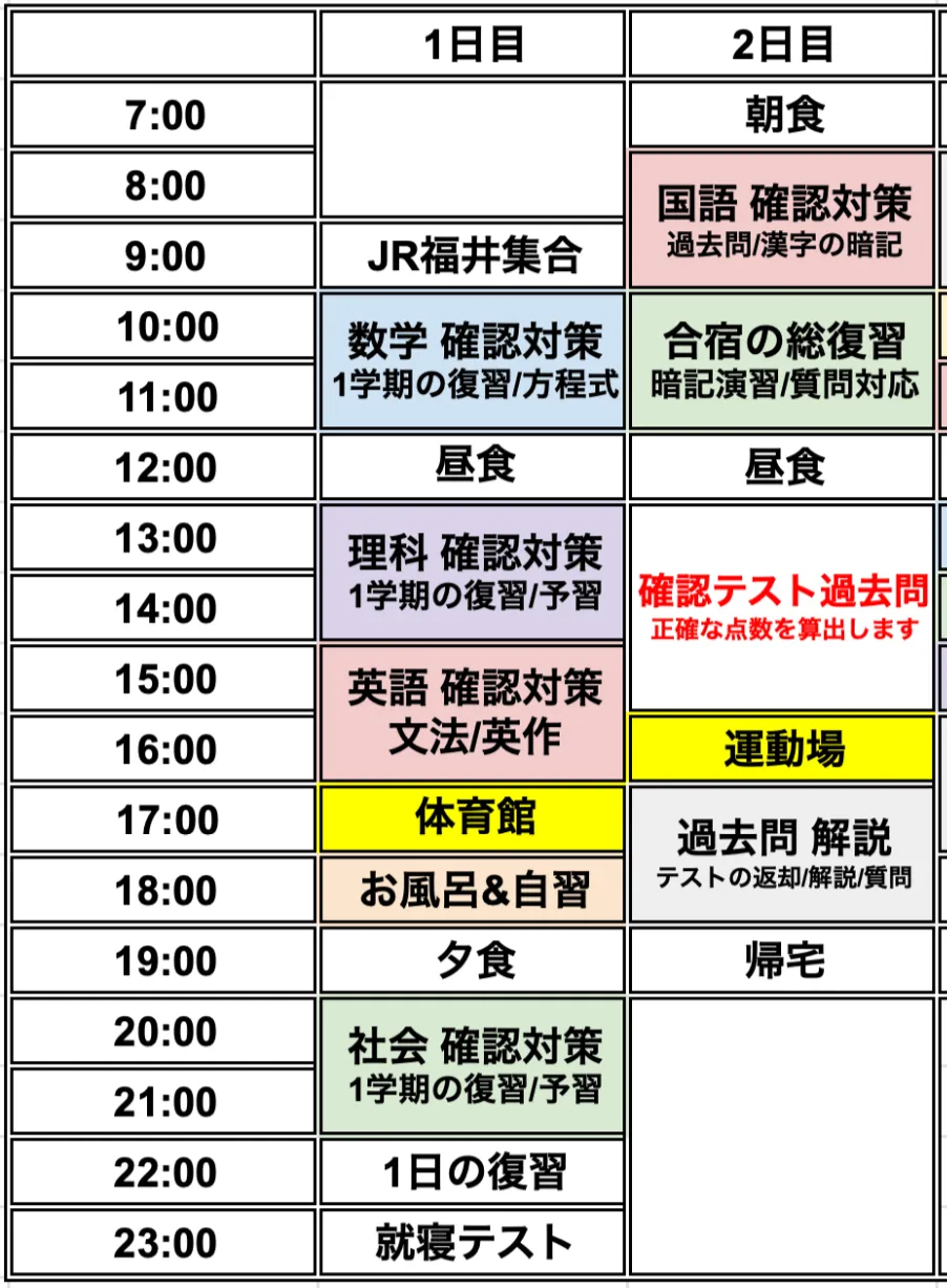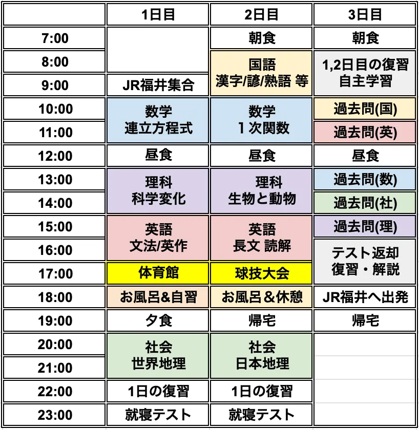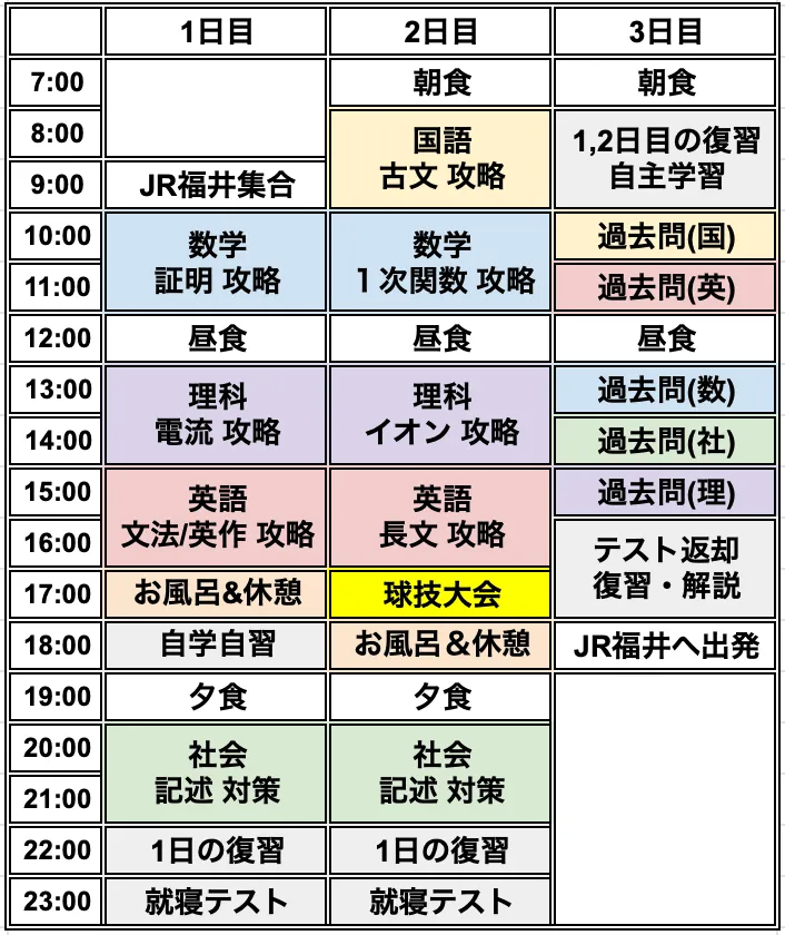 中学3年生の合宿スケジュール